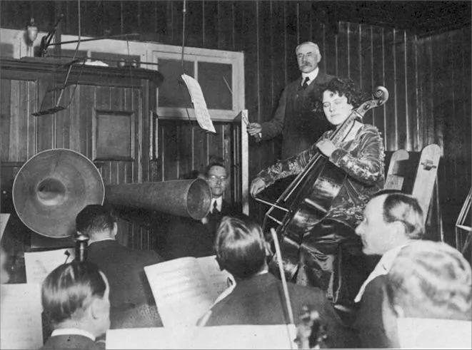 Die frühen Orchesteraufnahmen lassen sich, entsprechend der allgemeinen technischen Entwicklungsstufen, in zwei Phasen einteilen: In eine vor-elektrische und eine elektrische. Die vor-elektrische war eine rein akustische Aufnahme, bei der die Musiker:innen in einen Aufnahmetrichter buchstäblich hineinspielen mussten. [Abb.] Das Orchester war dementsprechend klein: Sämtliche Musiker:innen mussten möglichst nah am Trichter spielen, damit die von ihnen produzierten Klänge auf der Aufnahme ausreichend präsent waren.