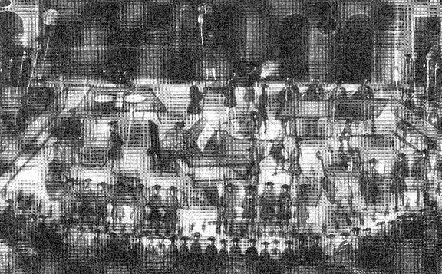 Beim Ensemblespiel existierten immer schon gewisse Leitungsfunktionen, aber lange wurden diese aus dem Ensemble heraus gestaltet. So waren es durch die Entwicklung des Basso Continuo [Abb.] zur rhythmischen Leitgruppe im 17. Jahrhundert zunächst häufig tastenspielende Musiker/-innen, die eine Leitungsfunktion einnahmen: Tasteninstrumente ermöglichten einhändiges Spielen, sodass die linke Hand die Basslinie spielen konnte, während die rechte zum Erteilen von Anweisungen verfügbar war. Nach dem Niedergang der Bedeutung des Basso Continuo im Laufe des 18. Jahrhunderts und dem damit verbundenen allmählichen Ausscheiden des Tasteninstruments aus den Instrumentalensembles ging die Leitungsfunktion zu Geige spielenden Ensemblemitgliedern über, da die zentrale Position im Ensemble sowie das Melodiespiel diese dazu prädestinierte. (Lit.: José Antonio Bowen, The rise of conducting)